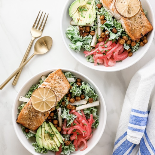 4️⃣ Toss kale with dressing. Divide into bowls. Top with salmon, avocado, pear, onions, and chickpeas. Serve immediately.